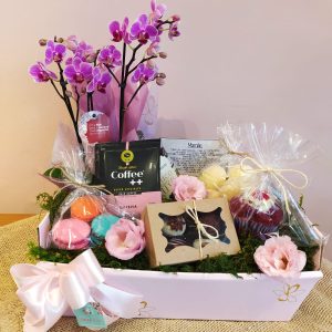 Encante-se com nossa cesta rústica, adornada com tecido, que envolve cuidadosamente cada item selecionado. Delicie-se com a beleza de um antúrio, acompanhado por um cupcake decorado que adoça a alma. Saboreie o conforto de uma porção de pão de queijo e a delícia de um alfajor. E para completar este momento especial, desfrute de um chá de infusão que aquece o coração.