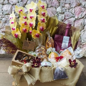 Encante-se com nossa cesta rústica, adornada com tecido, que envolve cuidadosamente cada item selecionado. Delicie-se com a beleza de um antúrio, acompanhado por um cupcake decorado que adoça a alma. Saboreie o conforto de uma porção de pão de queijo e a delícia de um alfajor. E para completar este momento especial, desfrute de um chá de infusão que aquece o coração.