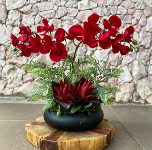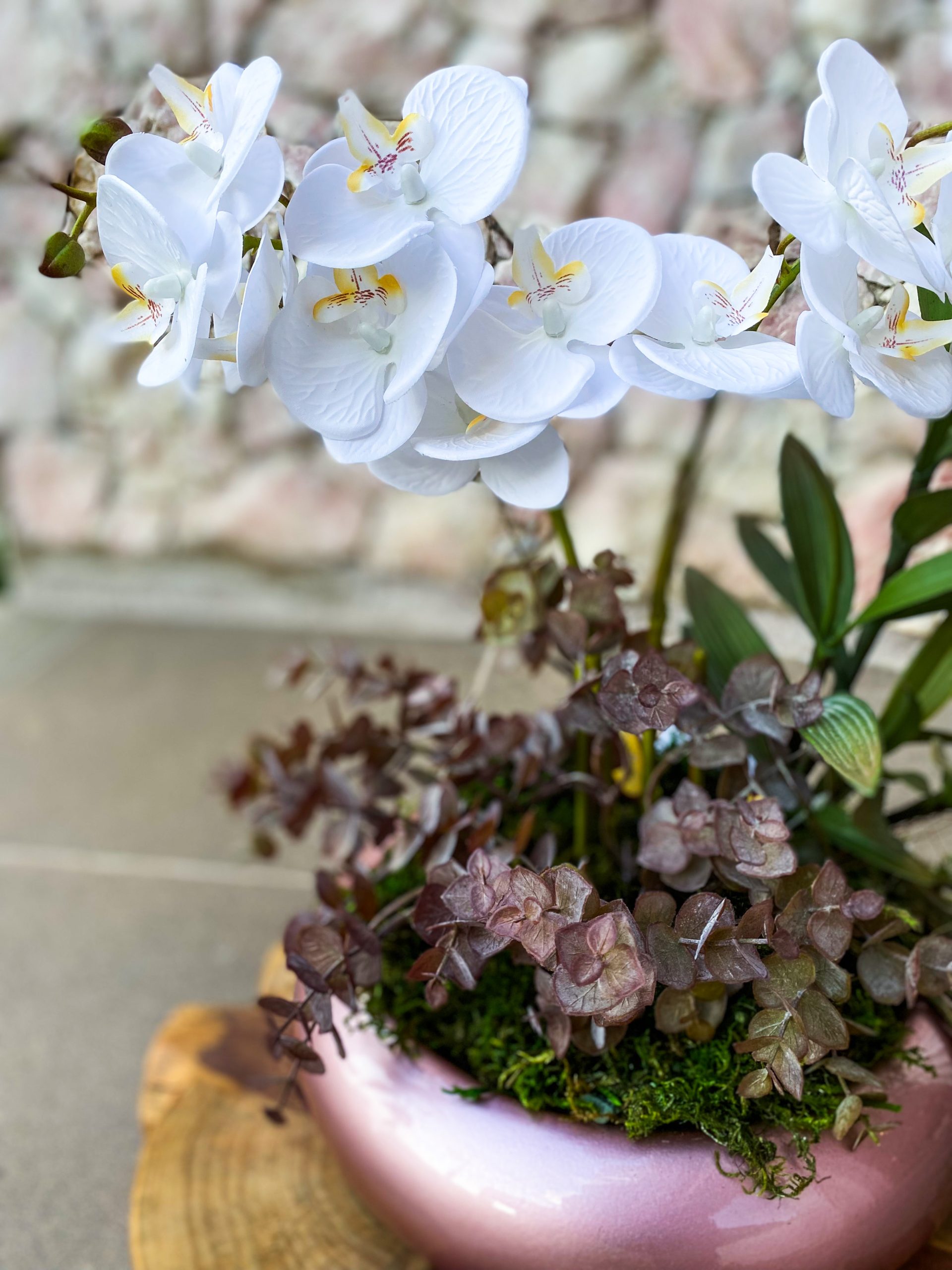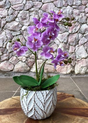 Arranjo contém: 2 galhos de Orquídeas na cor Branca + Galhos de Eucalipto + Galho de Verde + Vaso Fibra de Vidro Rosa Metalizado.