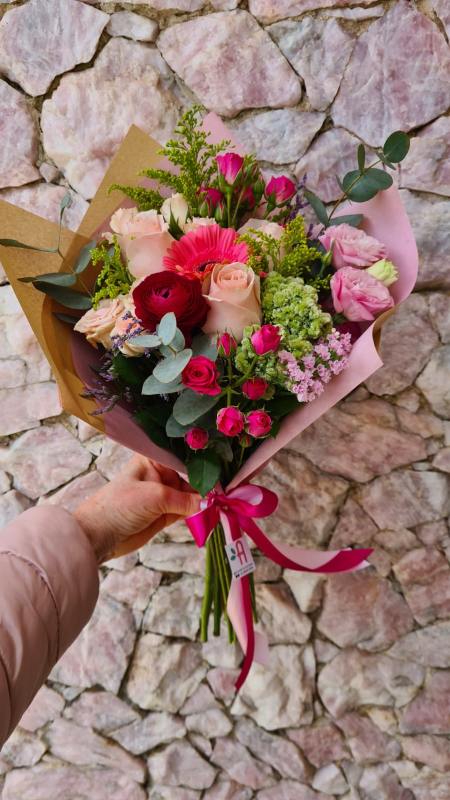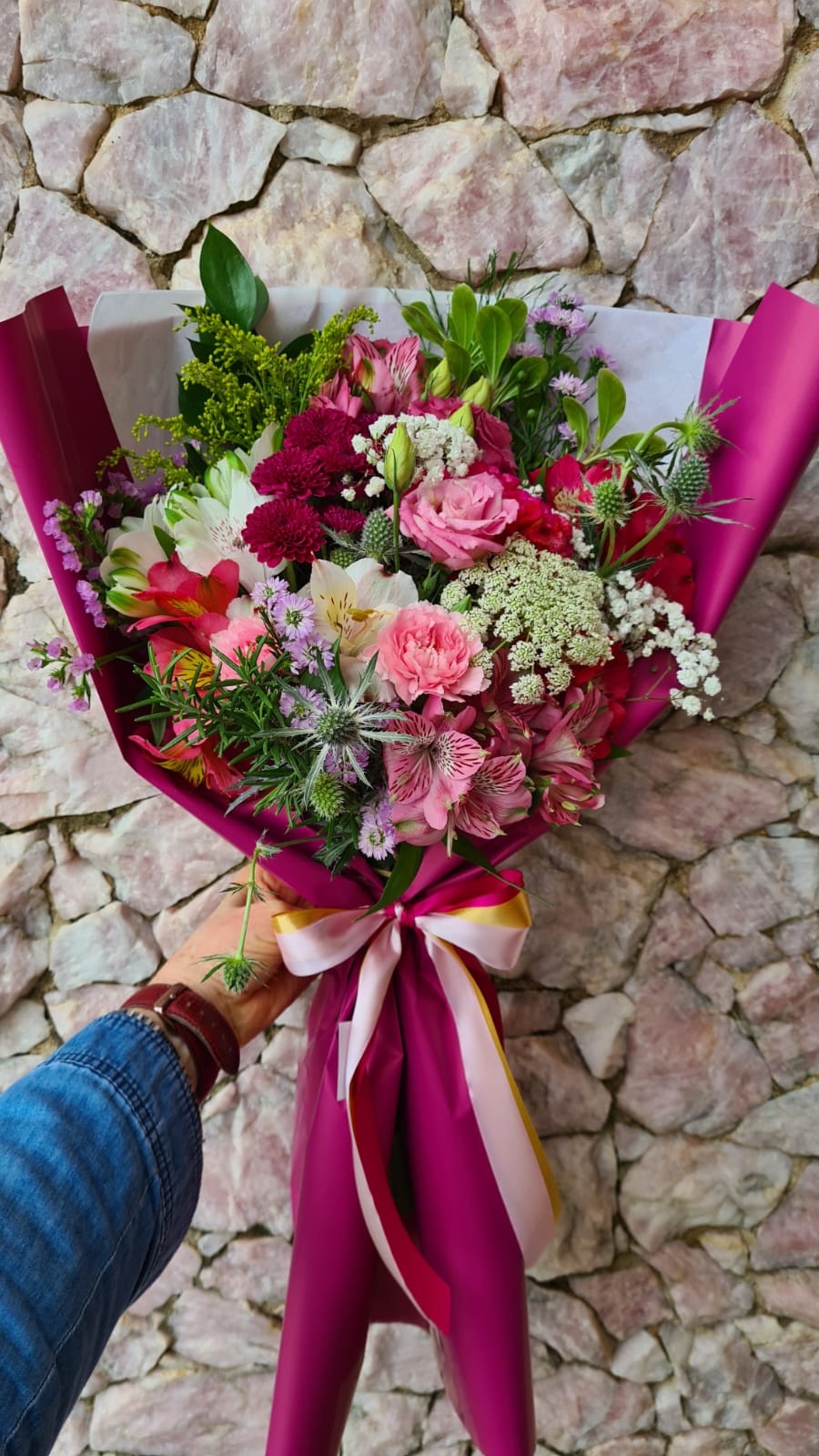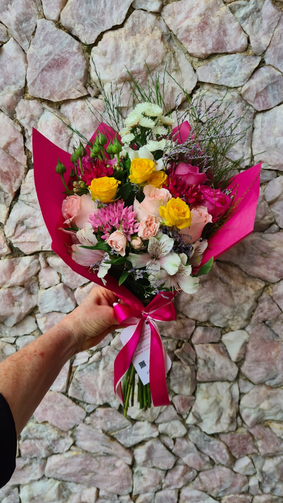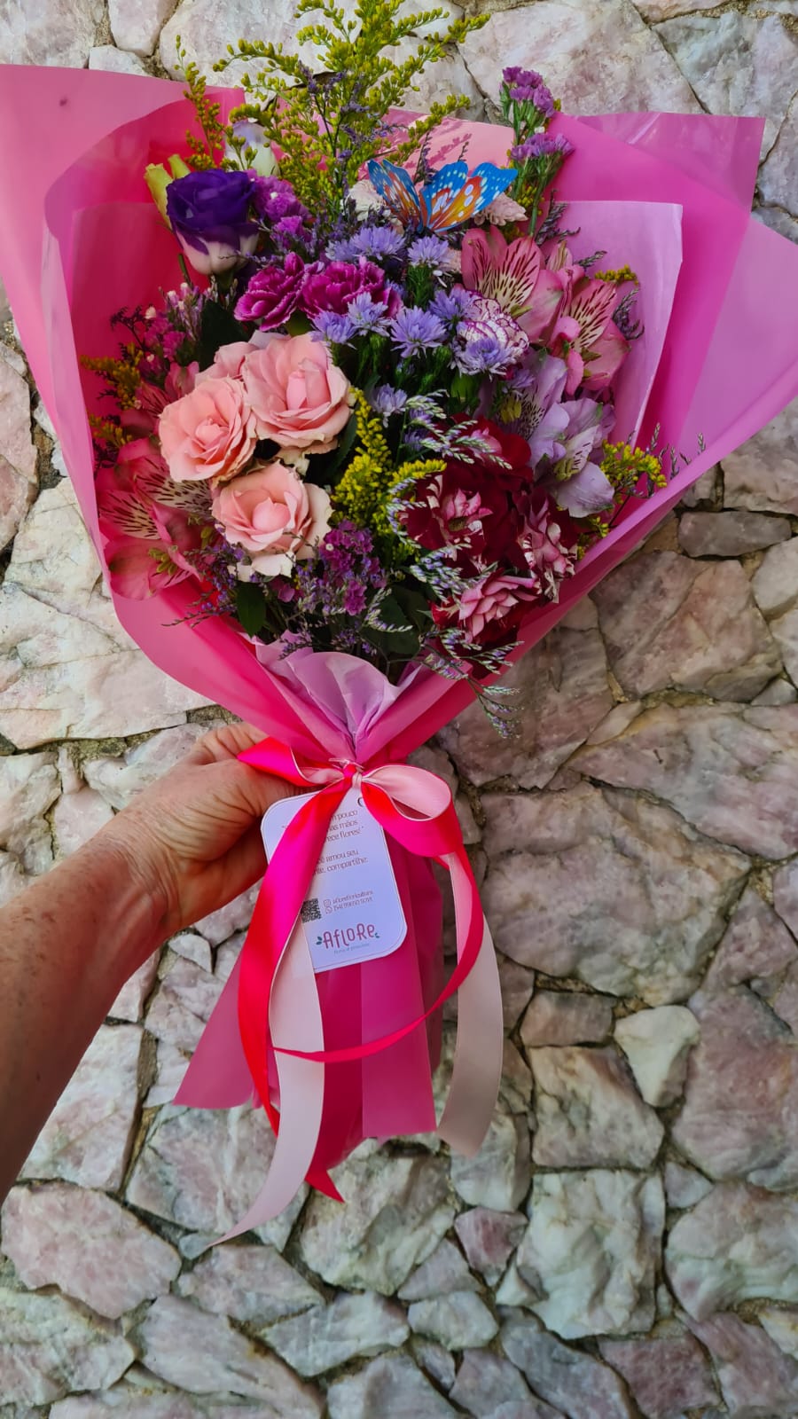 Este buquê encantador é uma explosão de cores, composto por flores naturais entre elas: flores do campo, astromélias, gerberas, mini rosas e verdes. Finalizado com papel kraft, laço de cetim e inclui um cartão personalizado.
