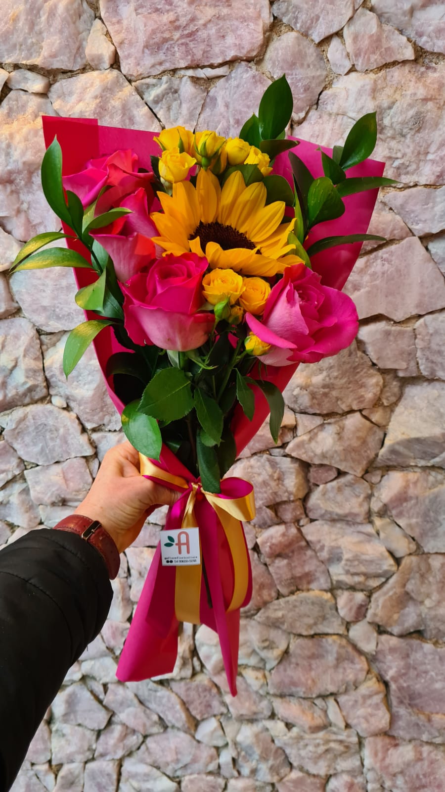 Buquê com Girassol, Rosa Pink e verdes forma uma combinação radiante e elegante, envoltas em papel kraft rosa para um toque de charme, finalizado com um delicado laço de cetim e um cartão personalizado.