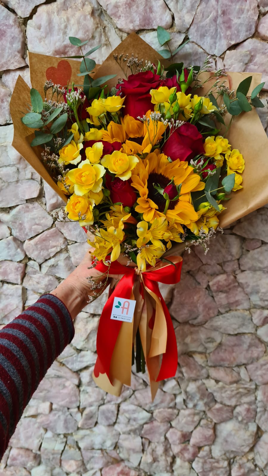 Buquê Moderno, composto por 6 rosas vermelhas, 2 girassóis, 3 mini rosas, astromélias e eucalipto, envolto em papel kraft de coração, finalizado com um laço de cetim e um cartão personalizado.