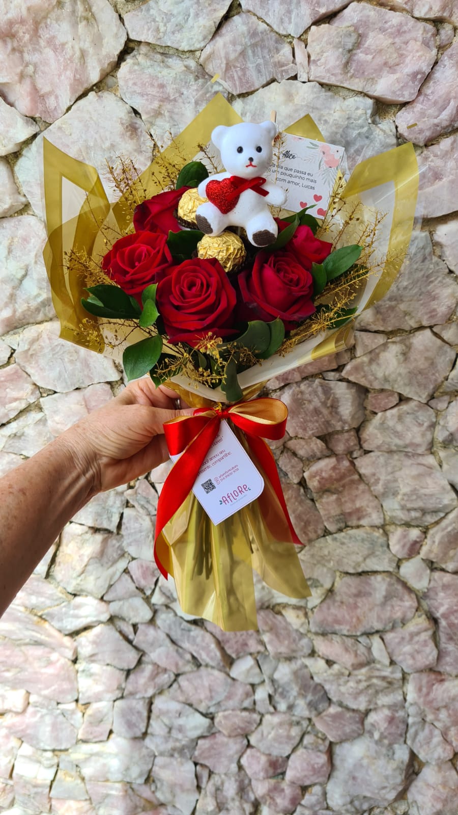 Buquê Moderno composto por flores naturais com 6 rosas vermelhas, 3 chocolates Ferrero Rocher, ruscus e flores desidratadas, acompanhados por um adorável ursinho. Envolto em papel dourado e laço de cetim, inclui um cartão personalizado.