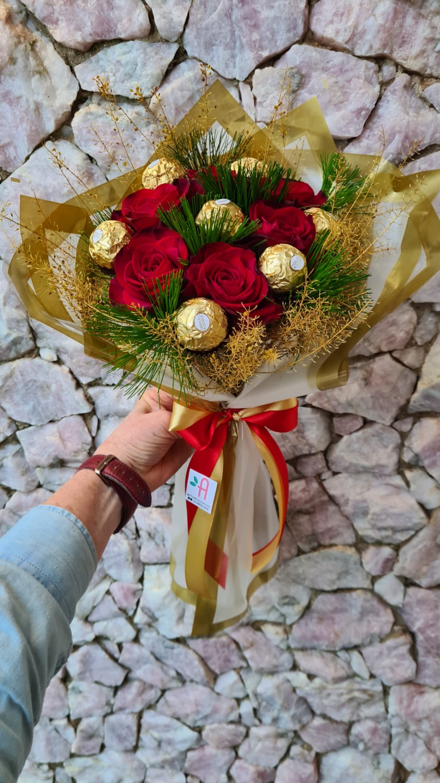 Buquê romântico com 6 rosas vermelhas, 8 chocolates Ferrero Rocher, flores desidratadas e papel dourado, finalizado com laço de cetim e cartão personalizado.