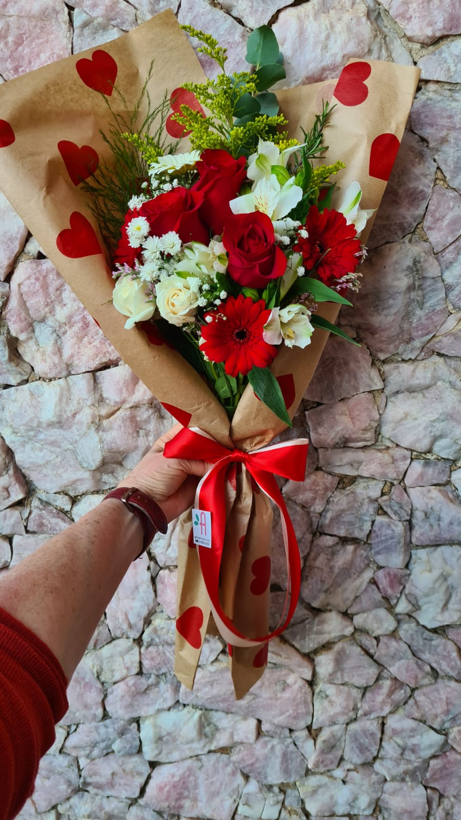 Buquê Romântico, composto por 3 rosas vermelhas, gerberas, astromélias e verdes, envoltos em papel kraft de coração, finalizado com um laço de cetim e um cartão personalizado.