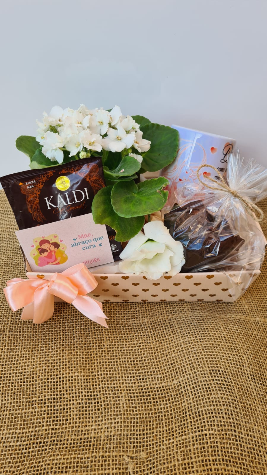 Um box presente repleto de carinho e cuidado. Desfrute de uma linda violeta ou calandiva flor natural, acompanhada por um drip coffee que desperta os sentidos. Mime-se com um cupcake decorado e leve para casa uma caneca personalizada para completar sua experiência única de amor e gratidão.