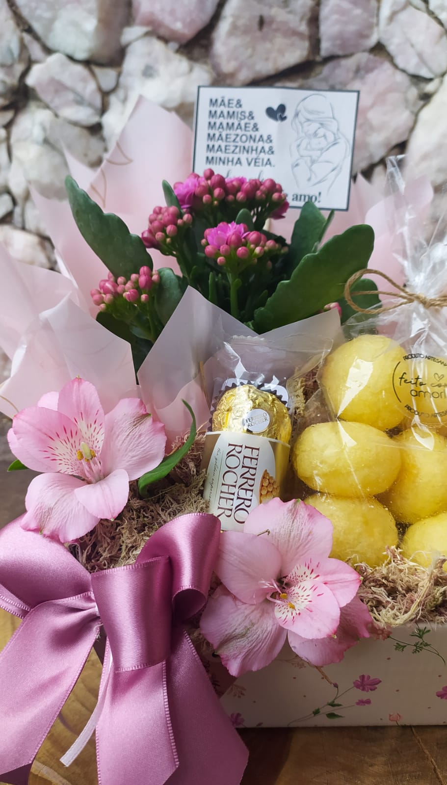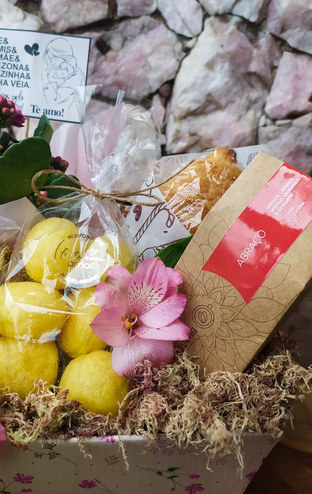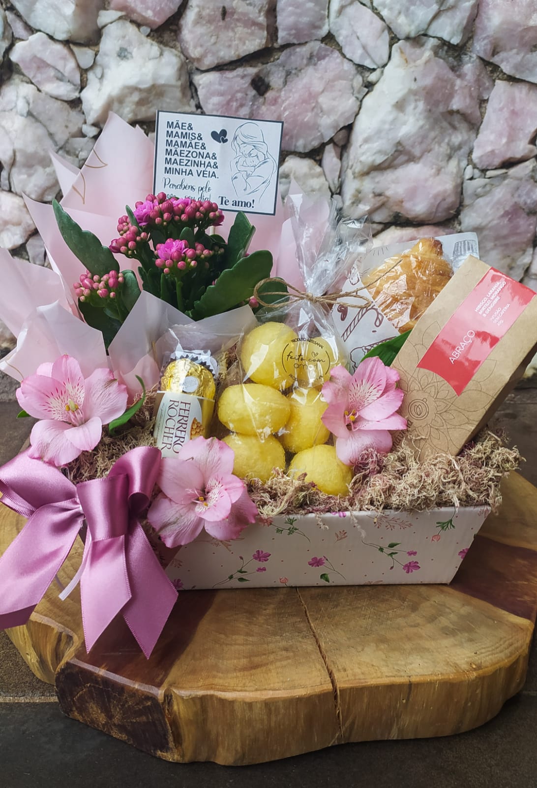 Ítens: 1 Chá Infusão de Folhas Secas 40g, 3 Bombom Ferrero Rocher 37g, 6 unidades de Mini Pão de Queijo, 1 Croissant.