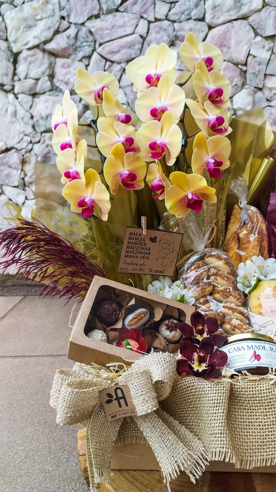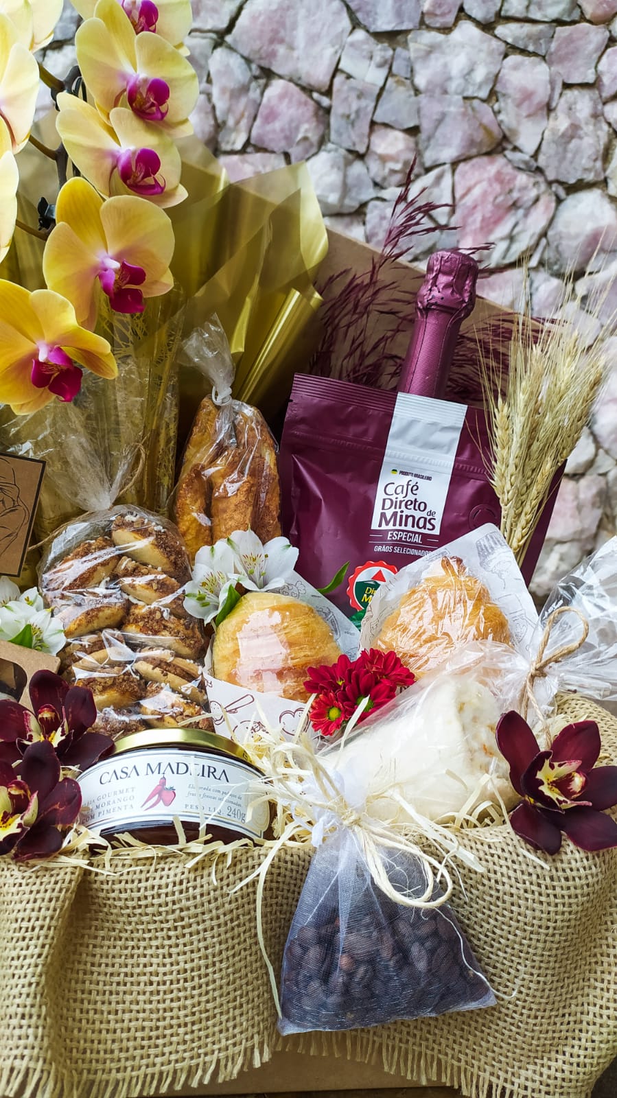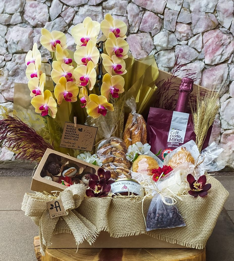 Ítens: 1 Espumante Aurora Moscatel Rosé 750ml, 1 Café Torrado e Moído Grãos Selecionados 250g, 6 unidades de Docinhos Sortidos, 2 Croissant, 1 Geléia Casa Madeira Gourmet 240g, Palitos de Queijo Folhado em torno de 180g, Alfajor de Nozes, Sanduíche Natural .