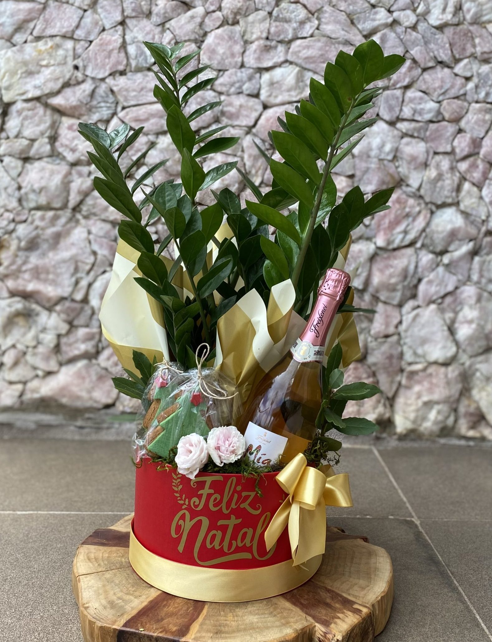 Kit Contém: Planta Natural Zamioculca pote pote 17 + Espumante Freixenet + Pão de Mel + Caixa em papel courino super resistente, com ornamentação em plástico, musgo, flores, laço de cetim e placa com mensagem Feliz Natal.