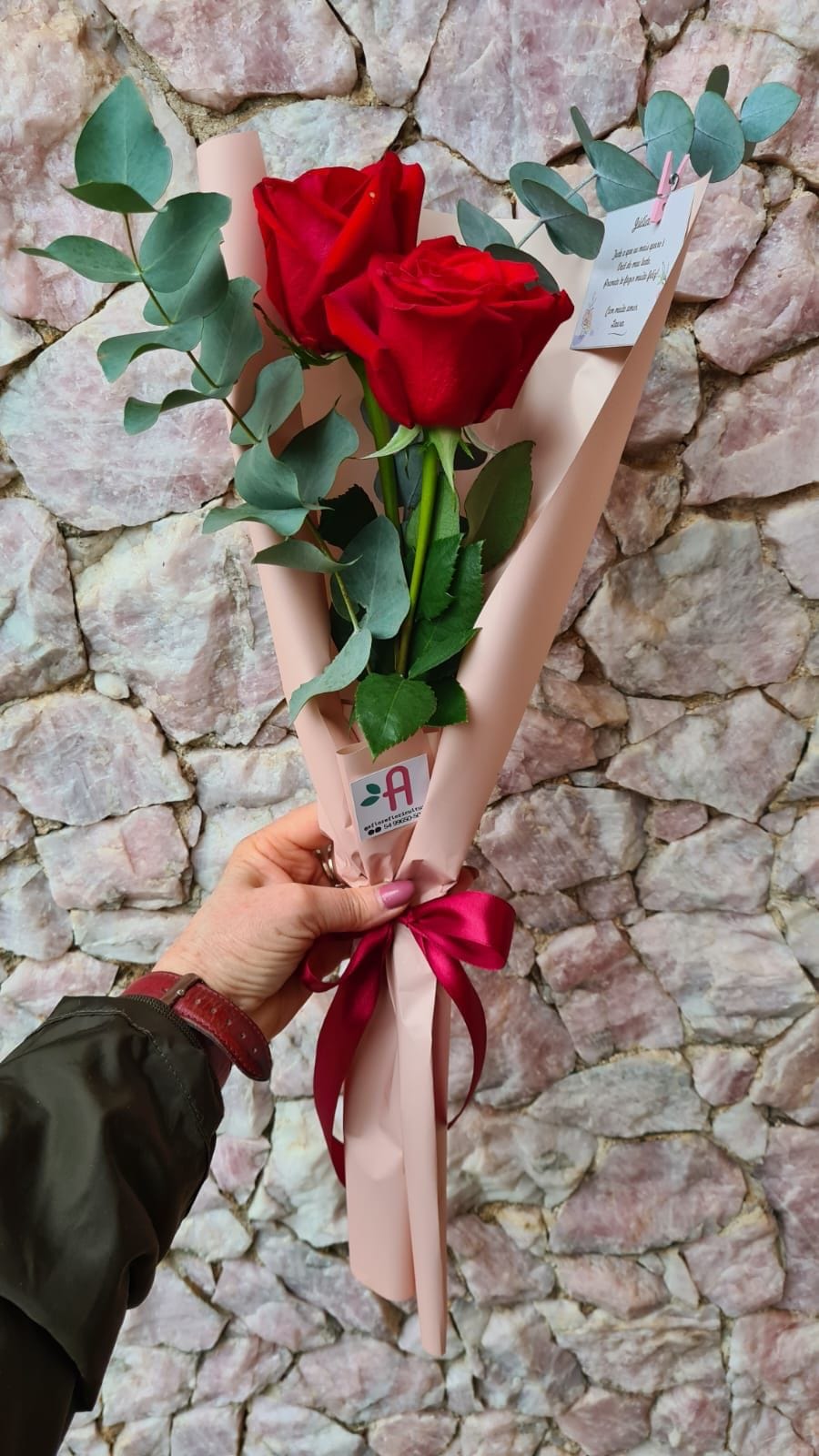 Um delicado mini buquê apresentando 2 rosas vermelhas, elegantemente envolto em papel rose e adornado com um laço de cetim. Complementado por um cartão personalizado, este buquê é um gesto de amor e carinho perfeito para expressar sentimentos especiais.