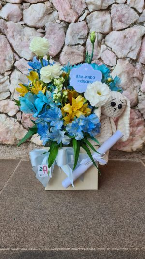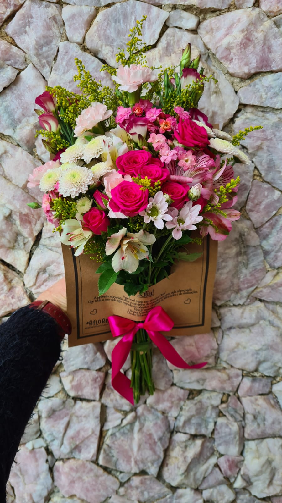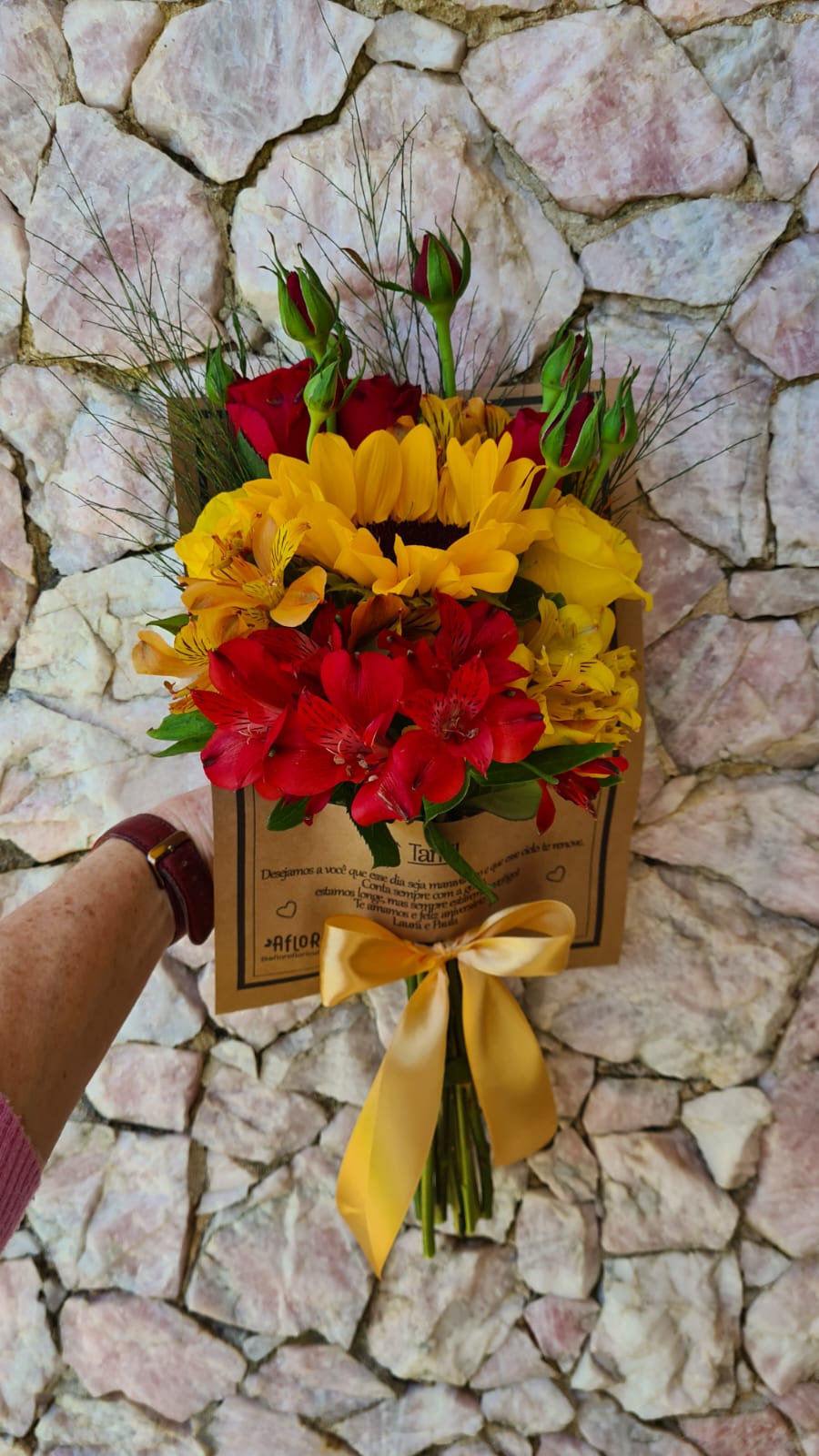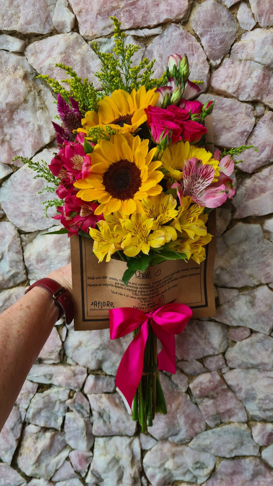 Flores Naturais: Rosas, Mini Rosas, Lisianthus, Girassol, Astromélias e Verdes.
