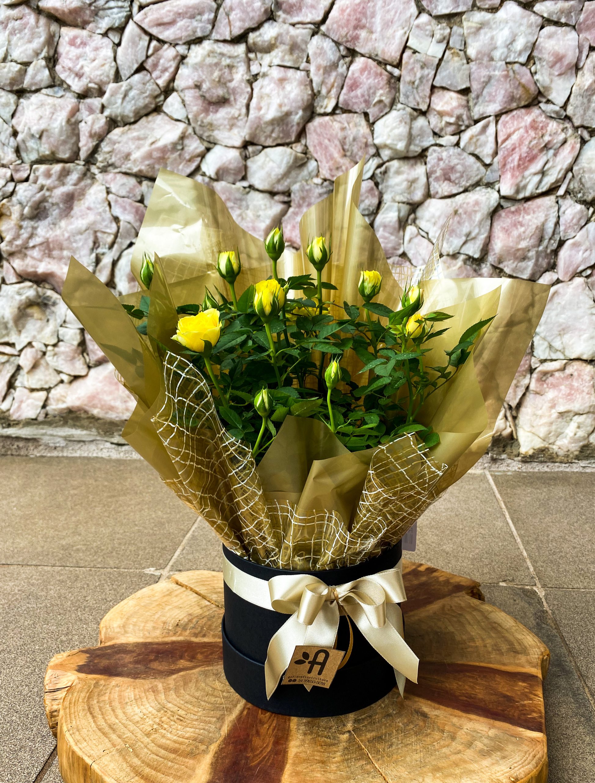 Ornamentação em plástico, cachepô de kraft, laço de cetim