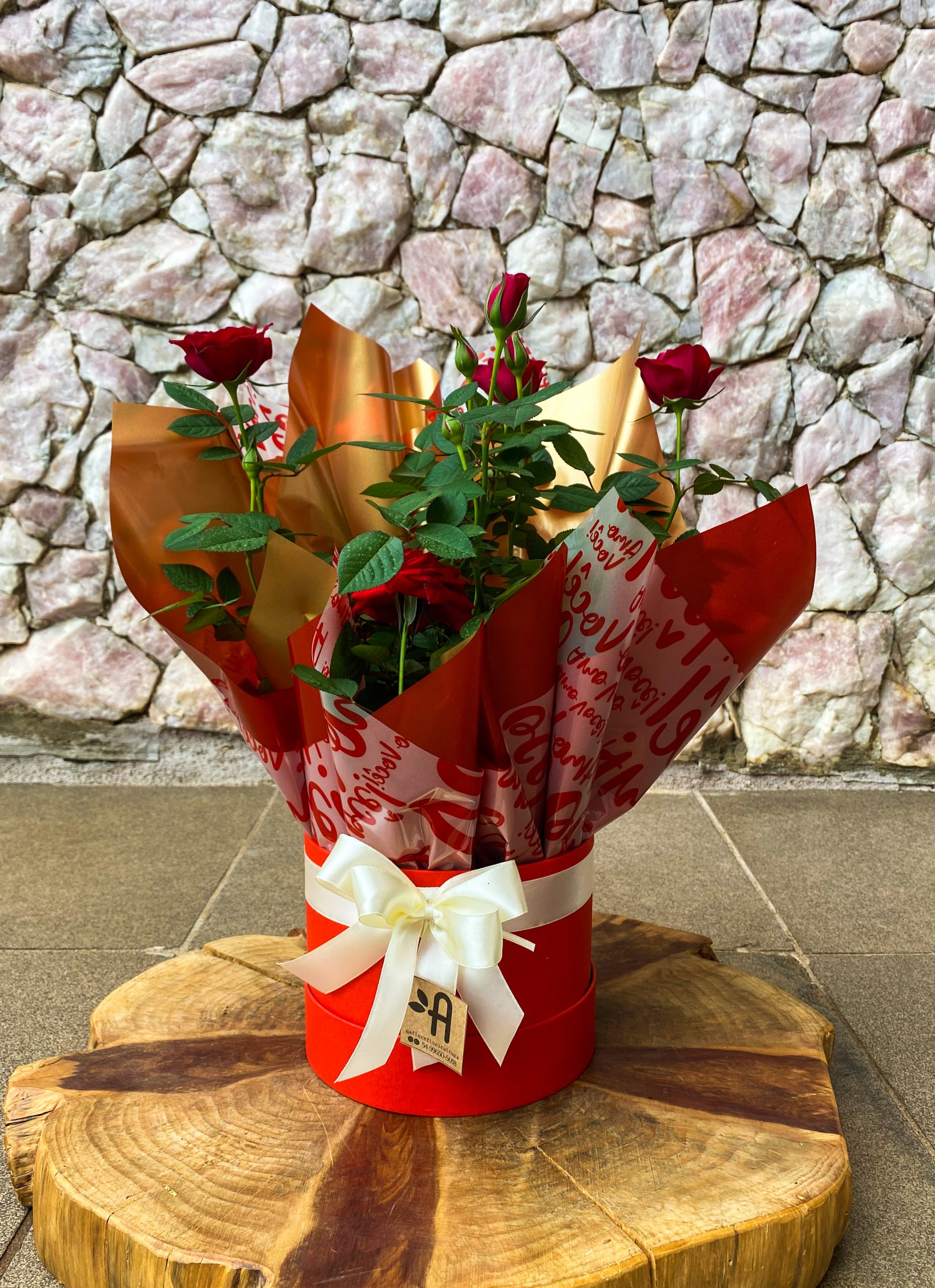 Caixa: Caixa Redonda com tampa super resistente, ornamentação em musgo, laço de cetim e placa com mensagem de sua escolha.